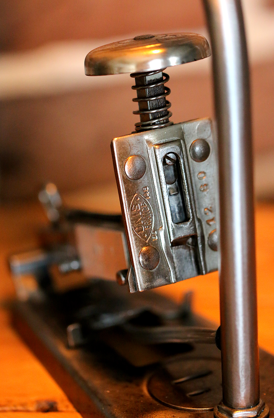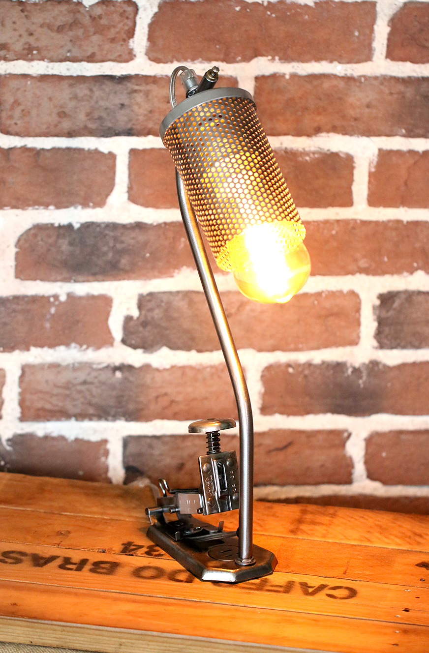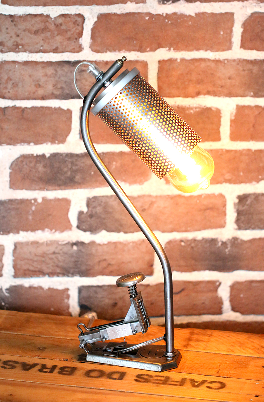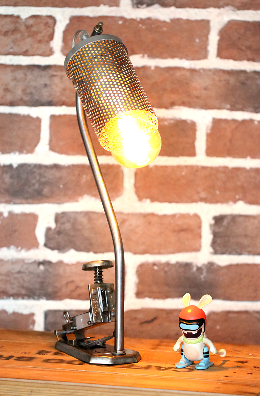 Un copain a chiné pour moi dans le Pas de Calais, une vielle Agrafeuse UNIS France JAKYNEUF entièrement rouillée, des années 1950. Après avoir, comme à mon habitude, brossé et dérouillé l’agrafeuse,  j’ai percé le socle pour y fixer une vielle barre de garde de corps en acier, qui elle-même soutien une coupole. Cette coupole est un ancien maillage d’un filtre à air de locomotive.