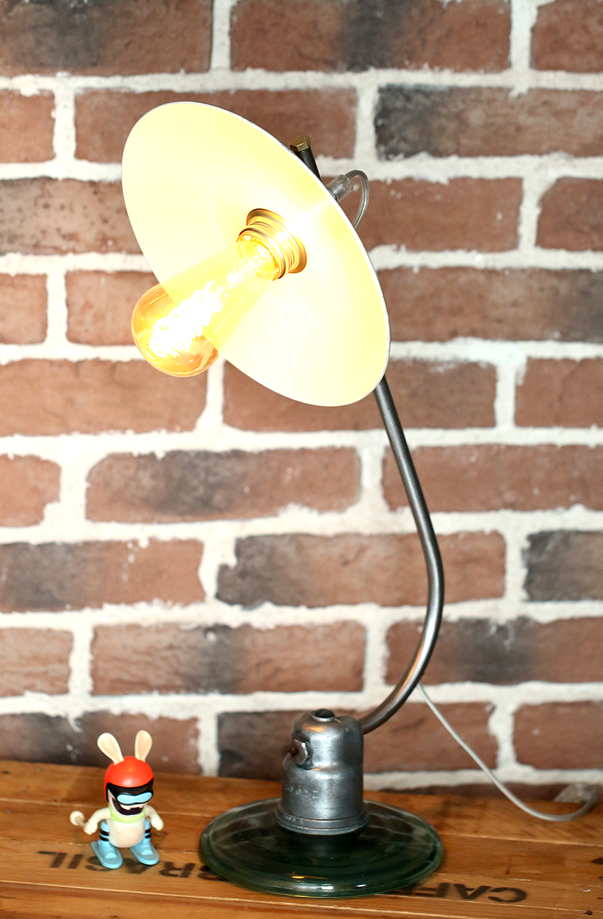 Un projet qui se veut industriel ou vintage selon la décoration que l’on possède. Une ancienne barre de corps sert de tubulure pour supporter une vieille coupole émaillée des années 50, qui appartenait à un ancien atelier de couture.