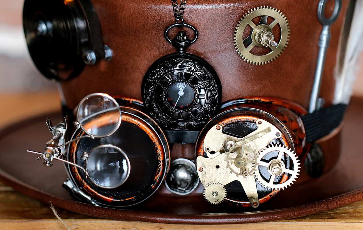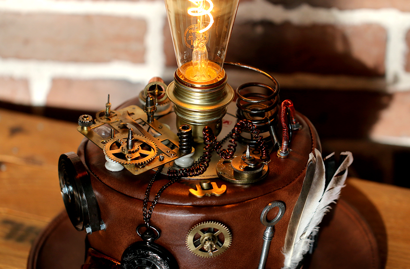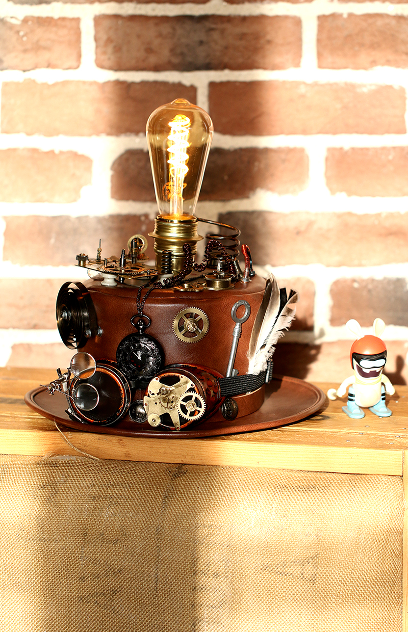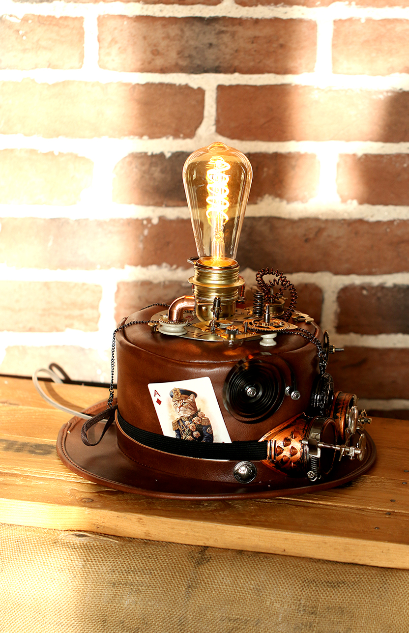 A partir d’un chapeau neuf, j’ai réalisé une lampe chapeau Steampunk. Plusieurs pièces de récupération de petites machines m’ont permis de créer cette composition. Elles accompagnent l’ampoule vintage à filament torsadé. Après brossage, découpe et soudure, notre imagination peut se laisser aller, on pourrait ainsi élucubrer que cette petite machinerie une fois en route, produit l’énergie suffisante pour allumer l’ampoule… et là je parle de nos idées !