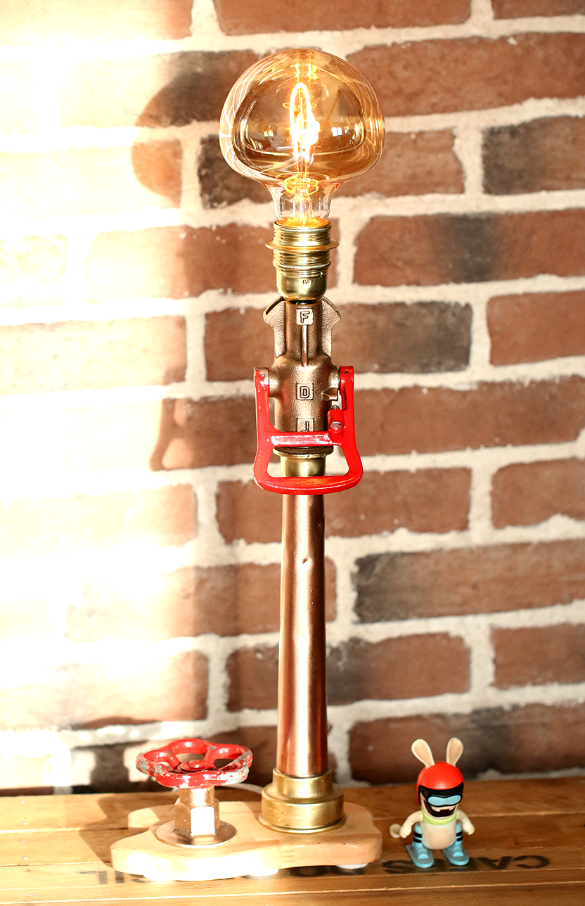 Lampe créée avec lance de pompier et une vanne de pompe. Une création qui se veut industrielle.