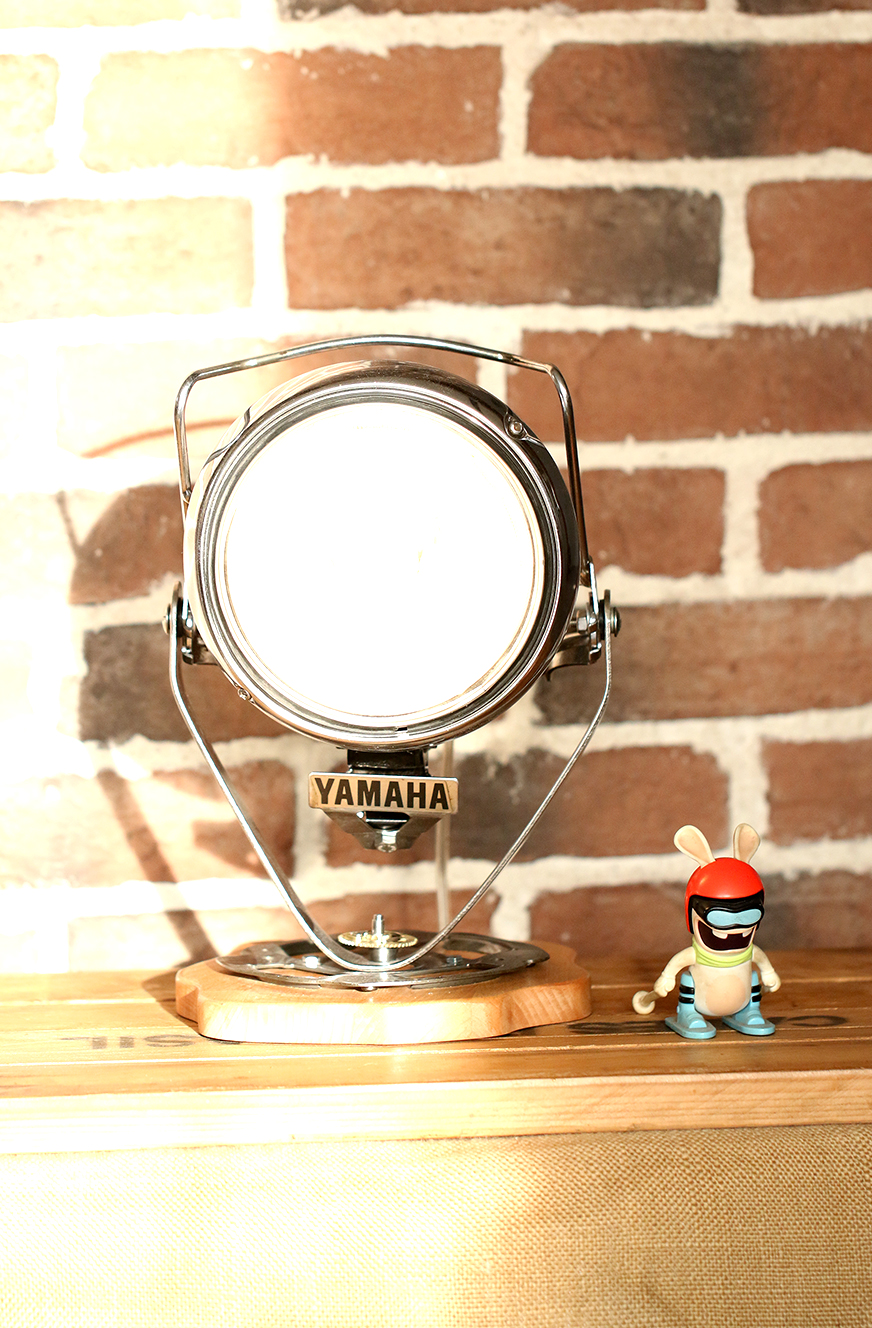 Cette lampe est réalisée à partir d’un ancien phare de moto YAMAHA datant des années 80. Le phare a un diamètre tout compris de 18 cm. Une belle pièce posée sur un morceau d’étagère en bois, décapé pour obtenir cette belle patine. Après avoir été entièrement décapé, le phare a été équipé d’une douille et ampoule de type G9 LED de 2W.