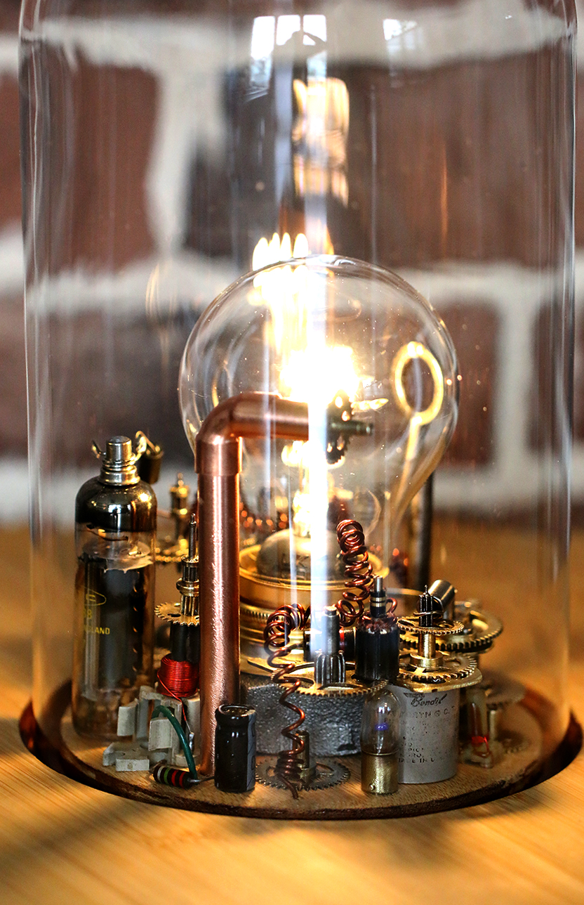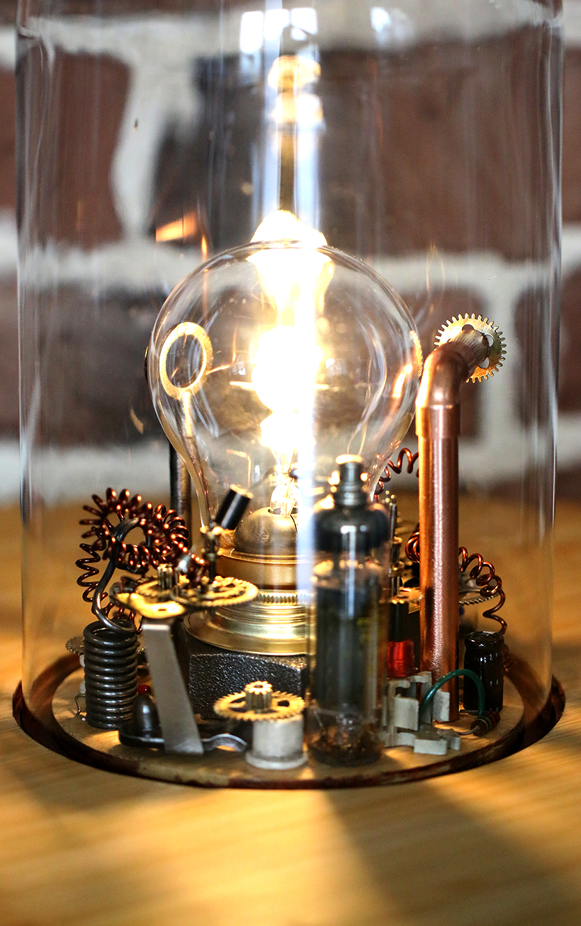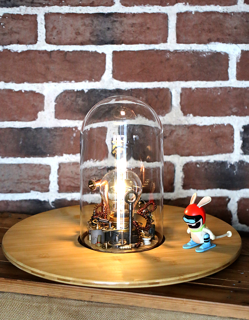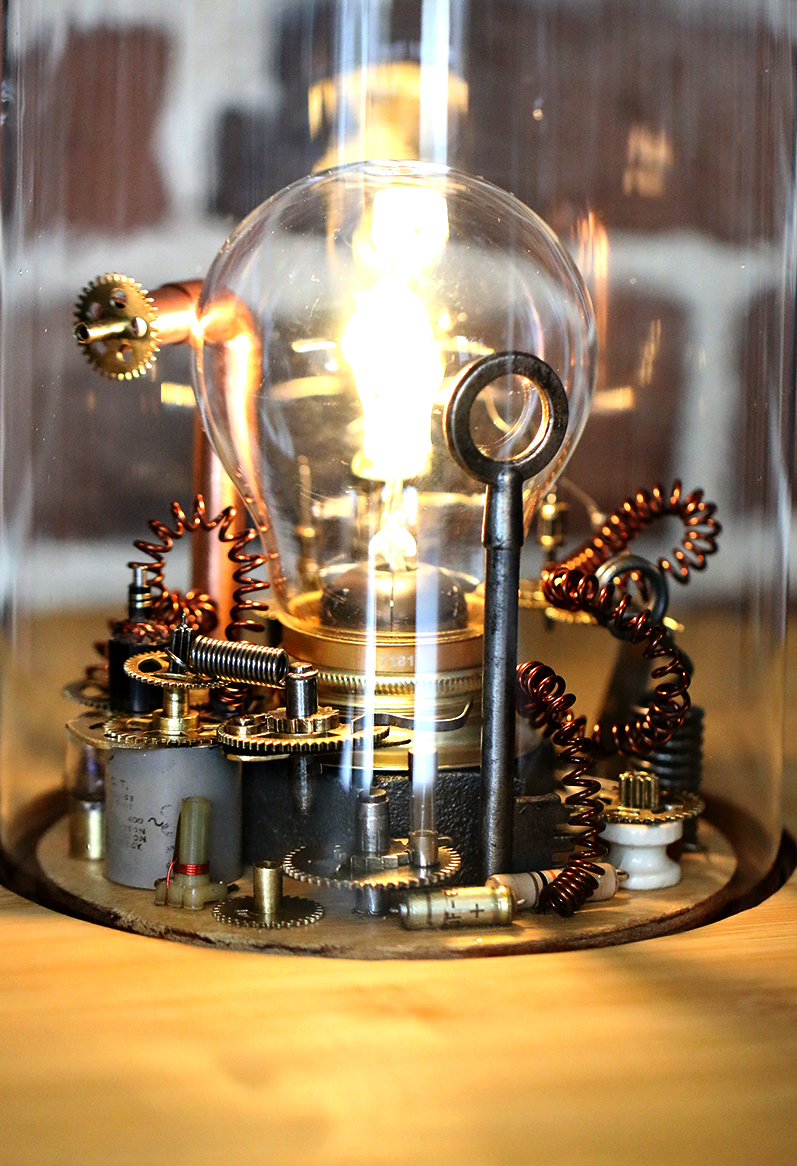 A partir d’une cloche de verre de décoration neuve et un plateau tournant, j’ai réalisé un plateau à fromage Steampunk illuminé. Plusieurs pièces de récupération de petites machines m’ont permis de créer cette composition. Après brossage, découpe et soudure, notre imagination peut se laisser aller, on pourrait ainsi élucubrer que cette petite machinerie une fois en route, produit l’énergie suffisante pour allumer l’ampoule…