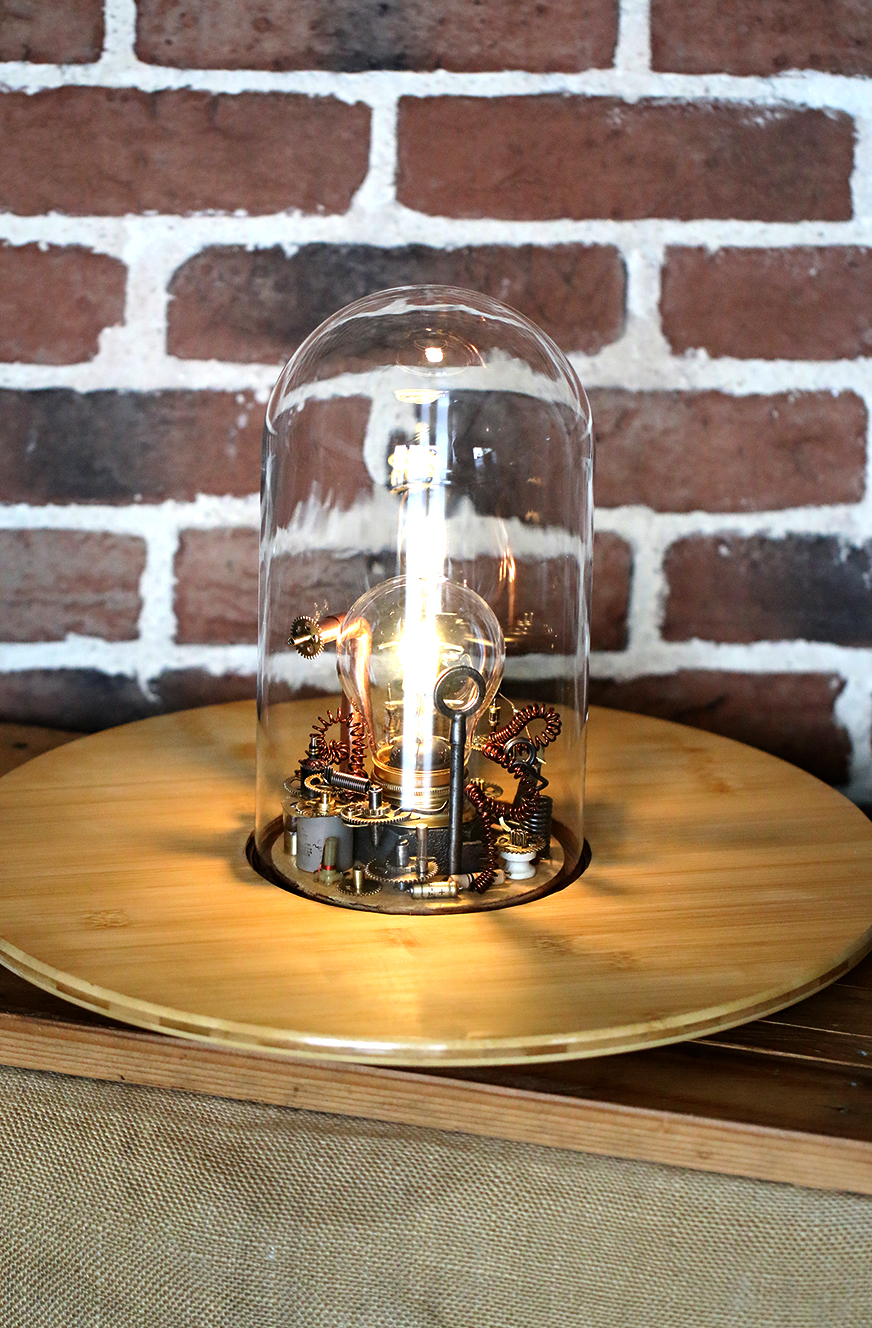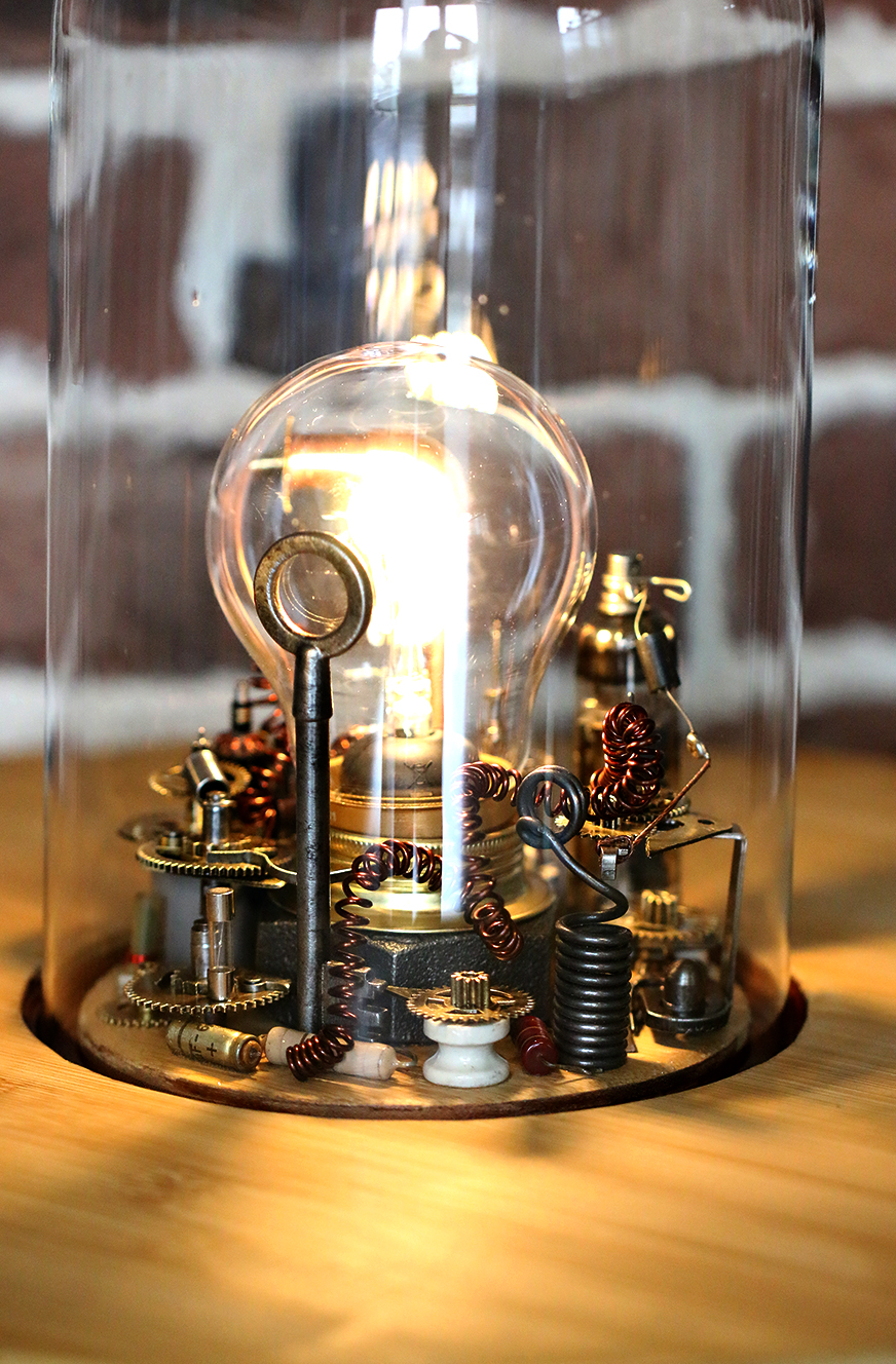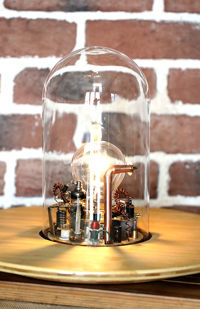 A partir d’une cloche de verre de décoration neuve et un plateau tournant, j’ai réalisé un plateau à fromage Steampunk illuminé. Plusieurs pièces de récupération de petites machines m’ont permis de créer cette composition. Après brossage, découpe et soudure, notre imagination peut se laisser aller, on pourrait ainsi élucubrer que cette petite machinerie une fois en route, produit l’énergie suffisante pour allumer l’ampoule…