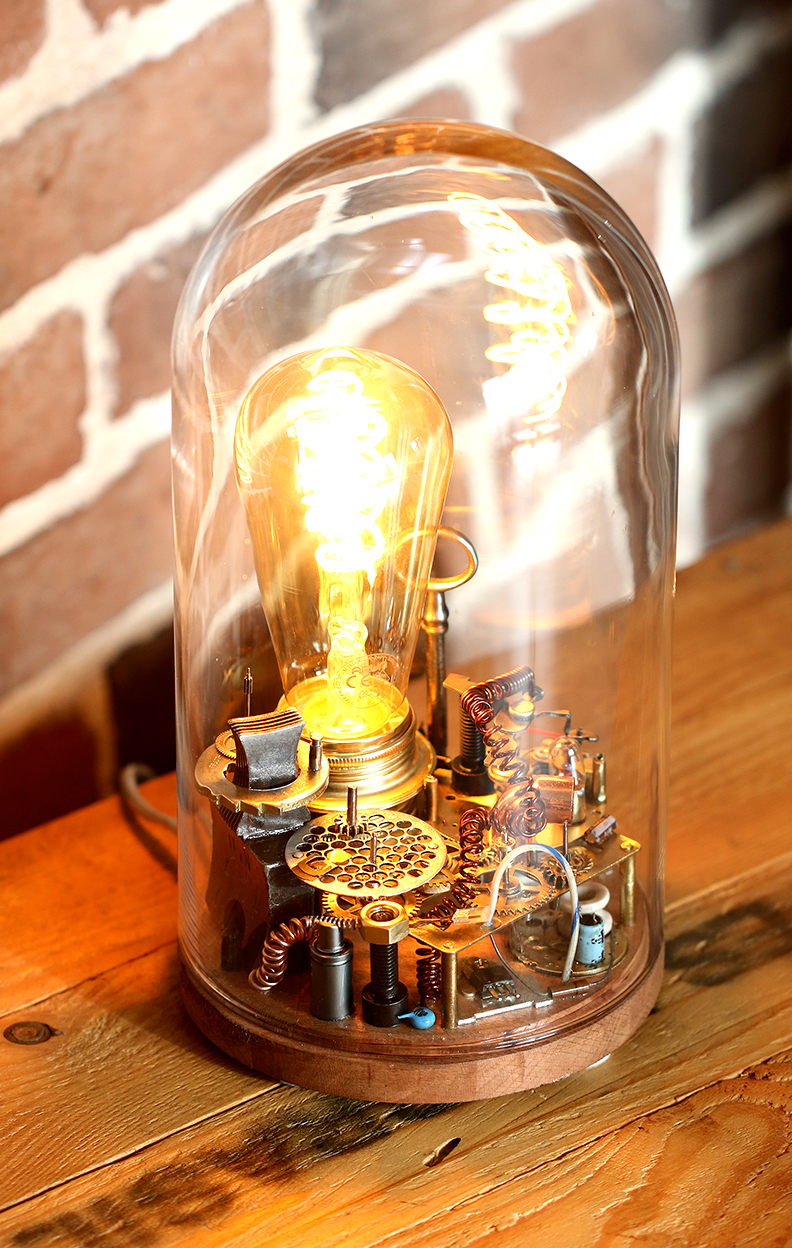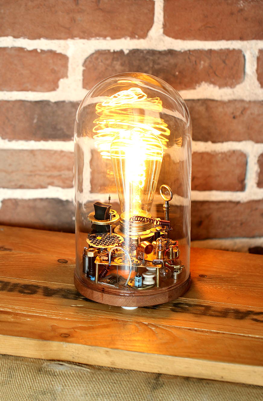 A partir d’une cloche de verre de décoration neuve j’ai réalisé une lampe Steampunk. Plusieurs pièces de récupération de petites machines m’ont permis de créer cette composition. Après brossage, découpe et soudure, notre imagination peut se laisser aller, on pourrait ainsi élucubrer que cette petite machinerie une fois en route, produit l’énergie suffisante pour allumer l’ampoule…
