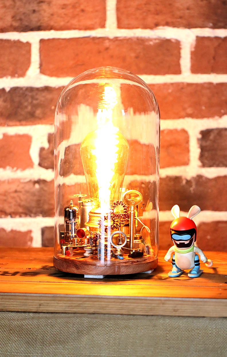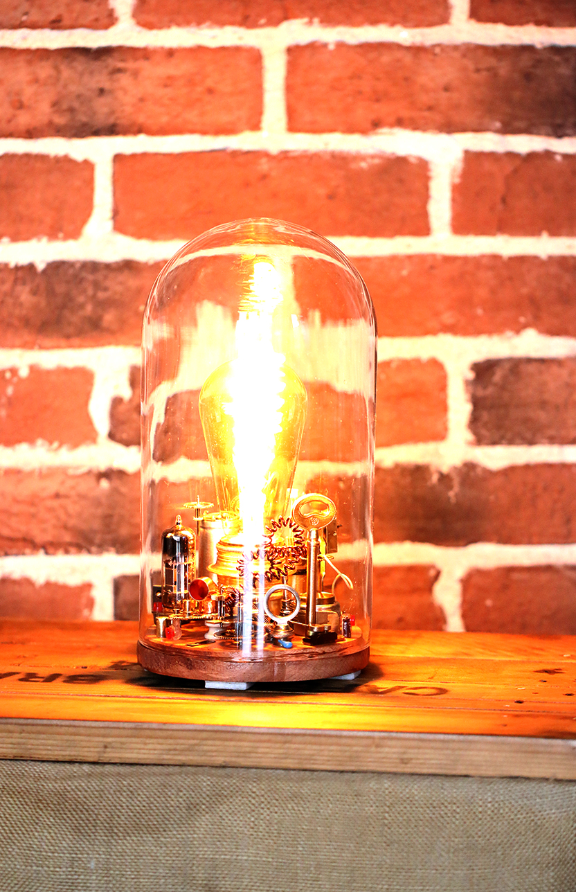 A partir d’une cloche de verre de décoration neuve j’ai réalisé une lampe Steampunk. Plusieurs pièces de récupération de petites machines m’ont permis de créer cette composition. Après brossage, découpe et soudure, notre imagination peut se laisser aller, on pourrait ainsi élucubrer que cette petite machinerie une fois en route, produit l’énergie suffisante pour allumer l’ampoule…