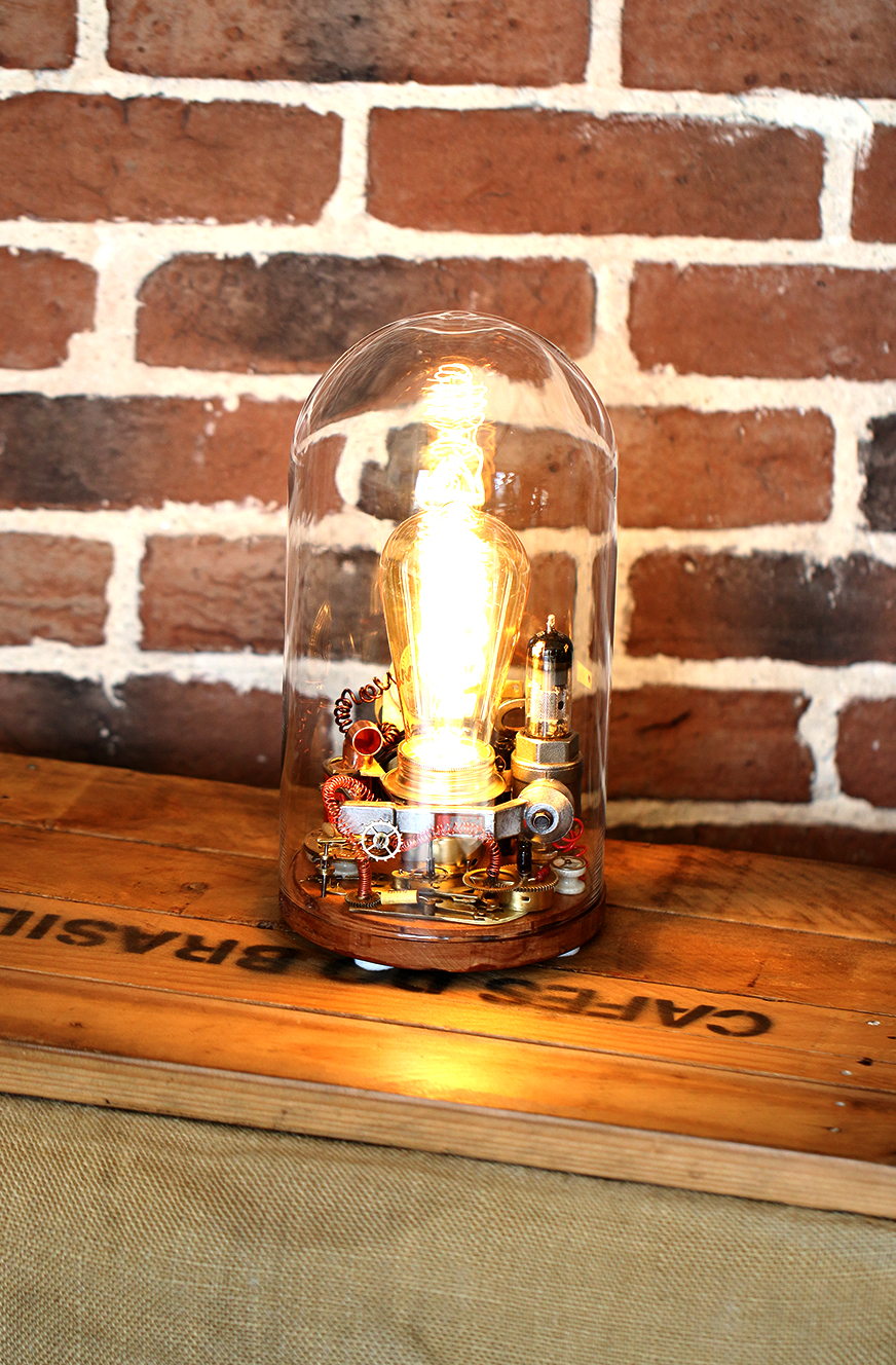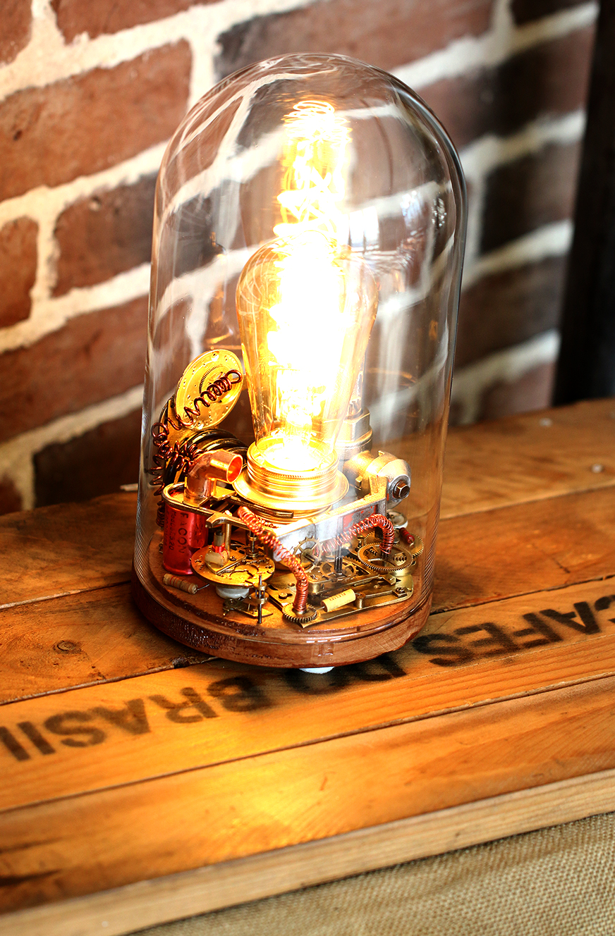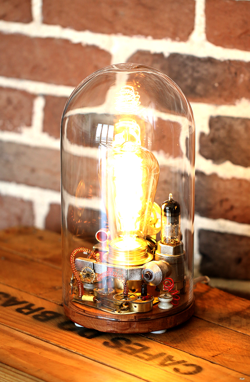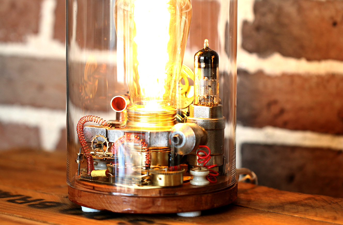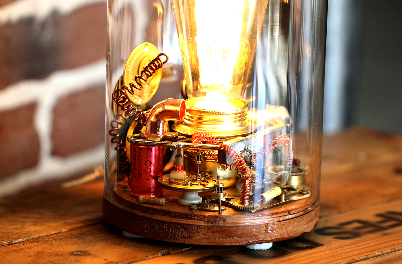 A partir d’une cloche de verre de décoration neuve j’ai réalisé une lampe Steampunk. Plusieurs pièces de récupération de petites machines m’ont permis de créer cette composition. Après brossage, découpe et soudure, notre imagination peut se laisser aller, on pourrait ainsi élucubrer que cette petite machinerie une fois en route, produit l’énergie suffisante pour allumer l’ampoule…