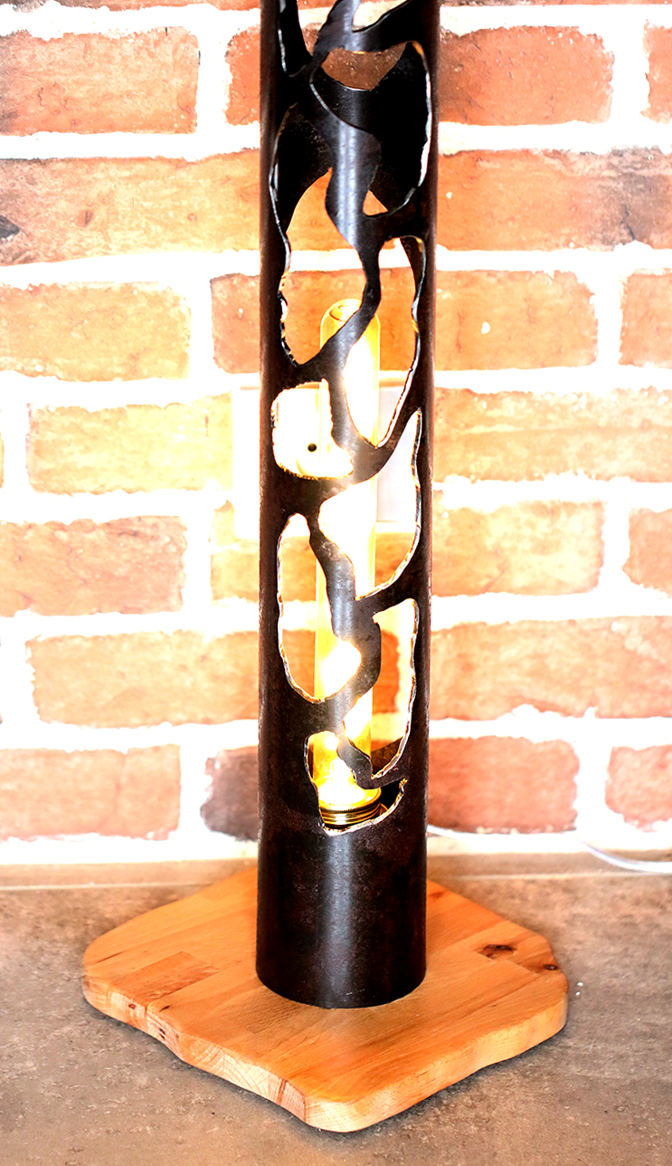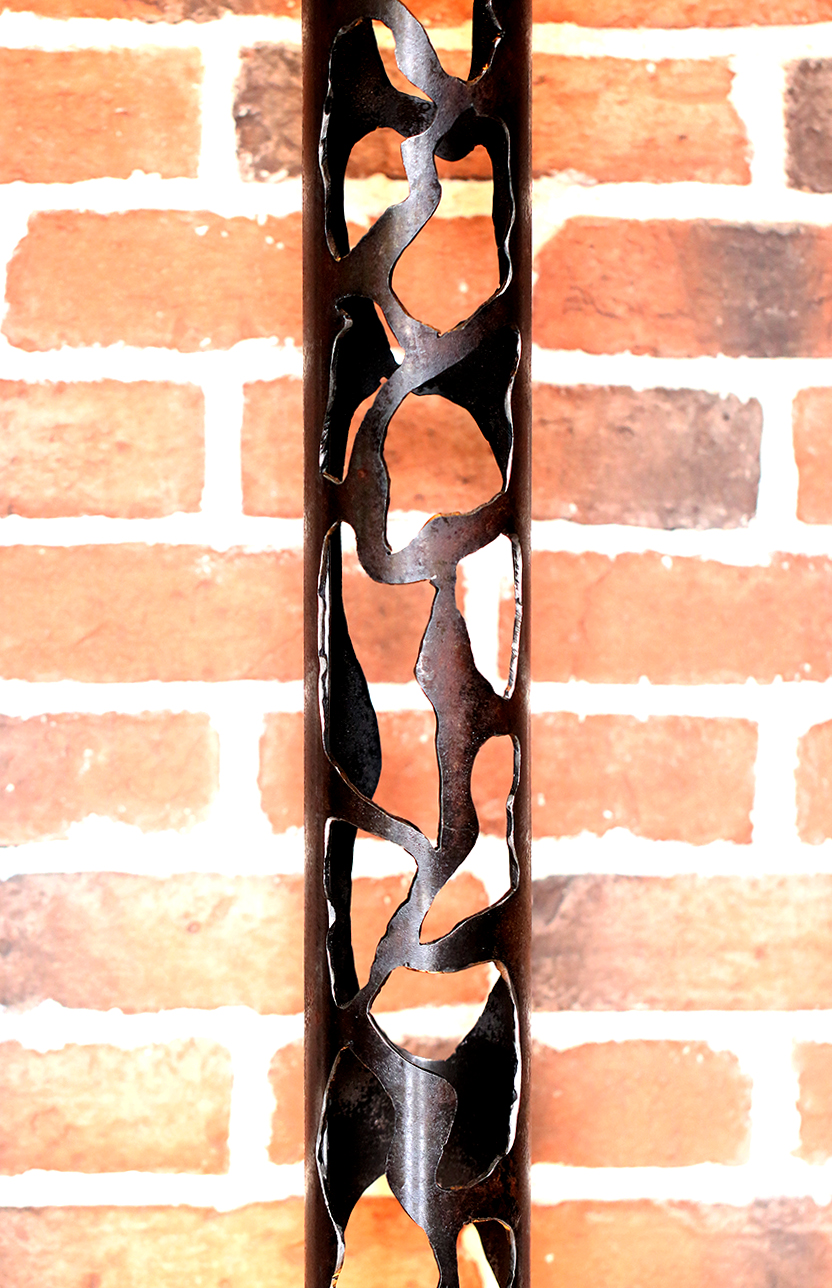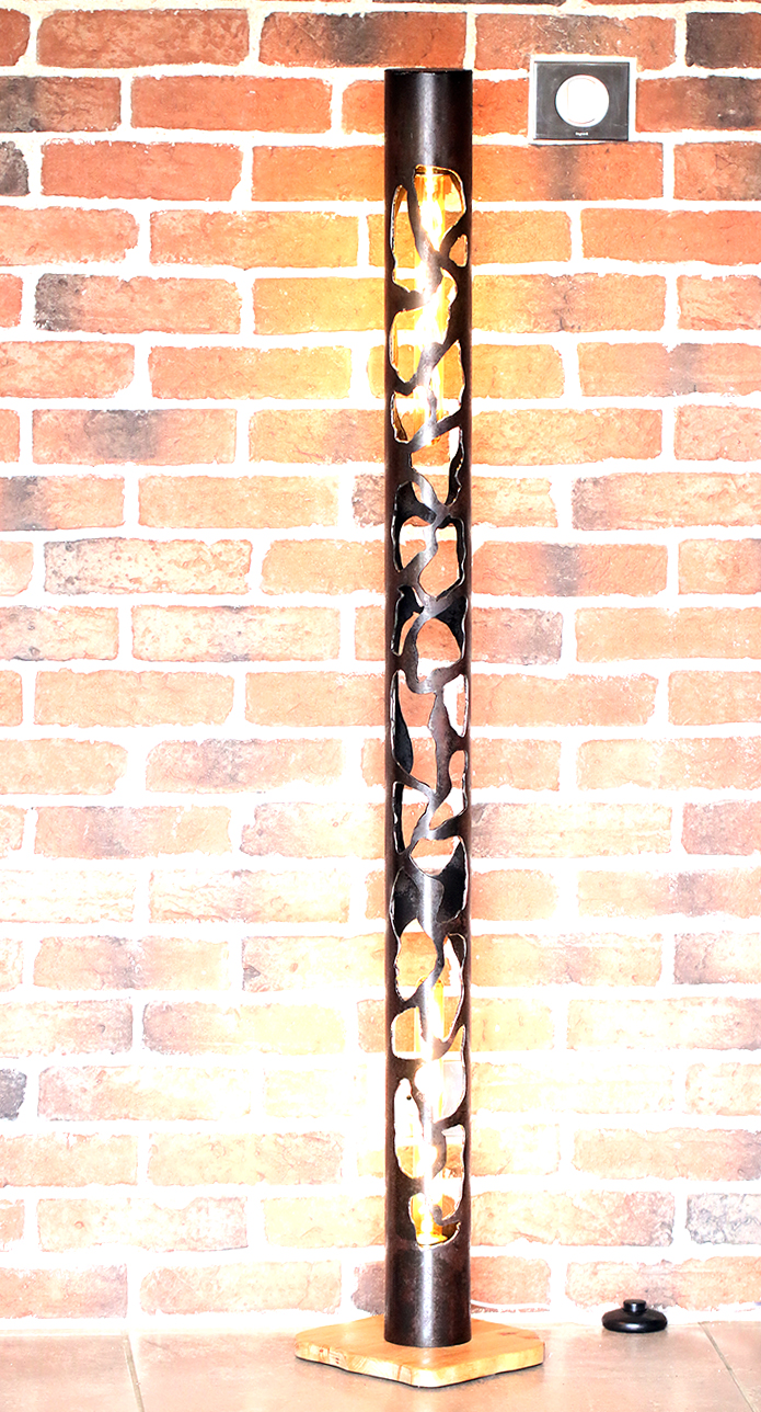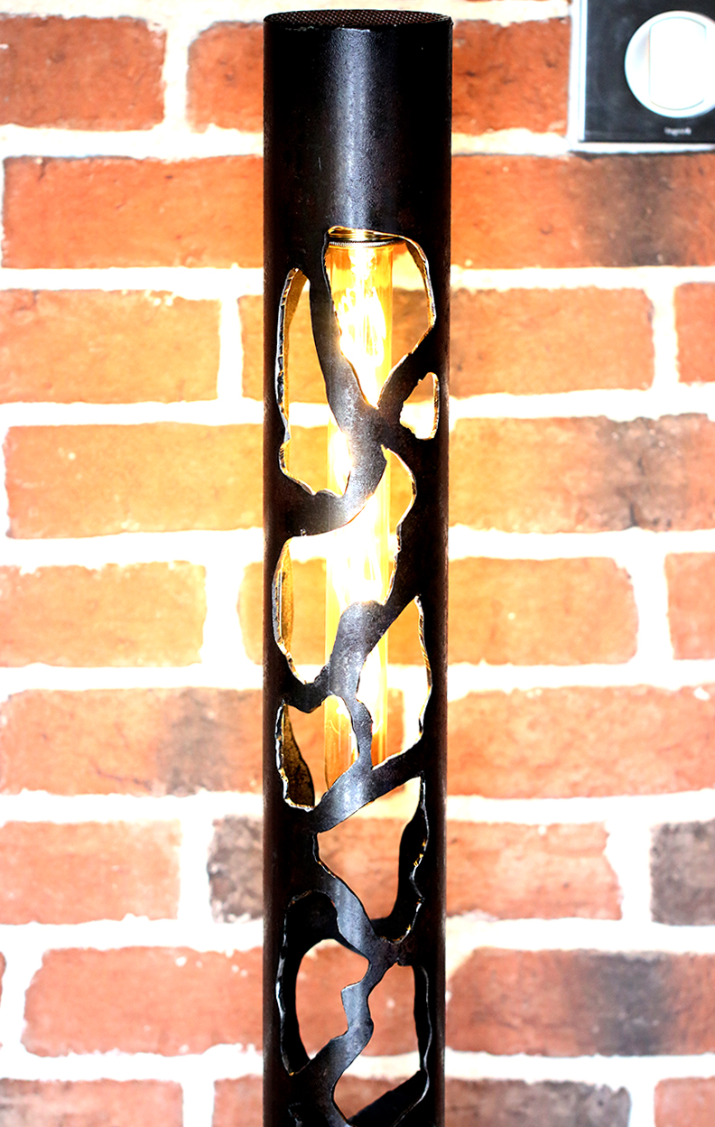 Après un long et fastidieux brossage à l’eau savonnée, j’ai retrouvé une superbe patine. Pour être le plus original possible j’ai décidé de découper le tube au plasma, et de donner l’impression que l’acier est déchiré… Une fois les espaces créés, j’ai façonné les supports de douilles pour pouvoir électrifier le tube en haut et en bas.